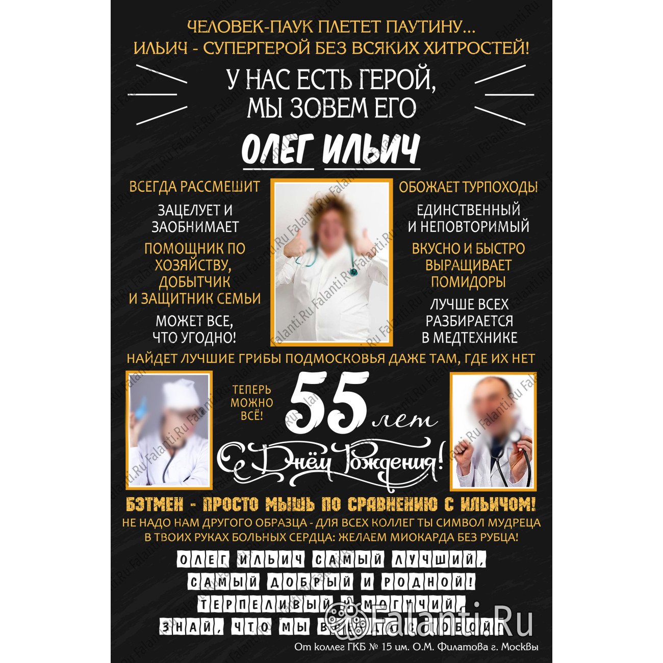 На плакате изображены три фотографии героя дня, дополненные забавными поздравлениями и пожеланиями. Такой презент добавит настроения и сделает праздник незабываемым.