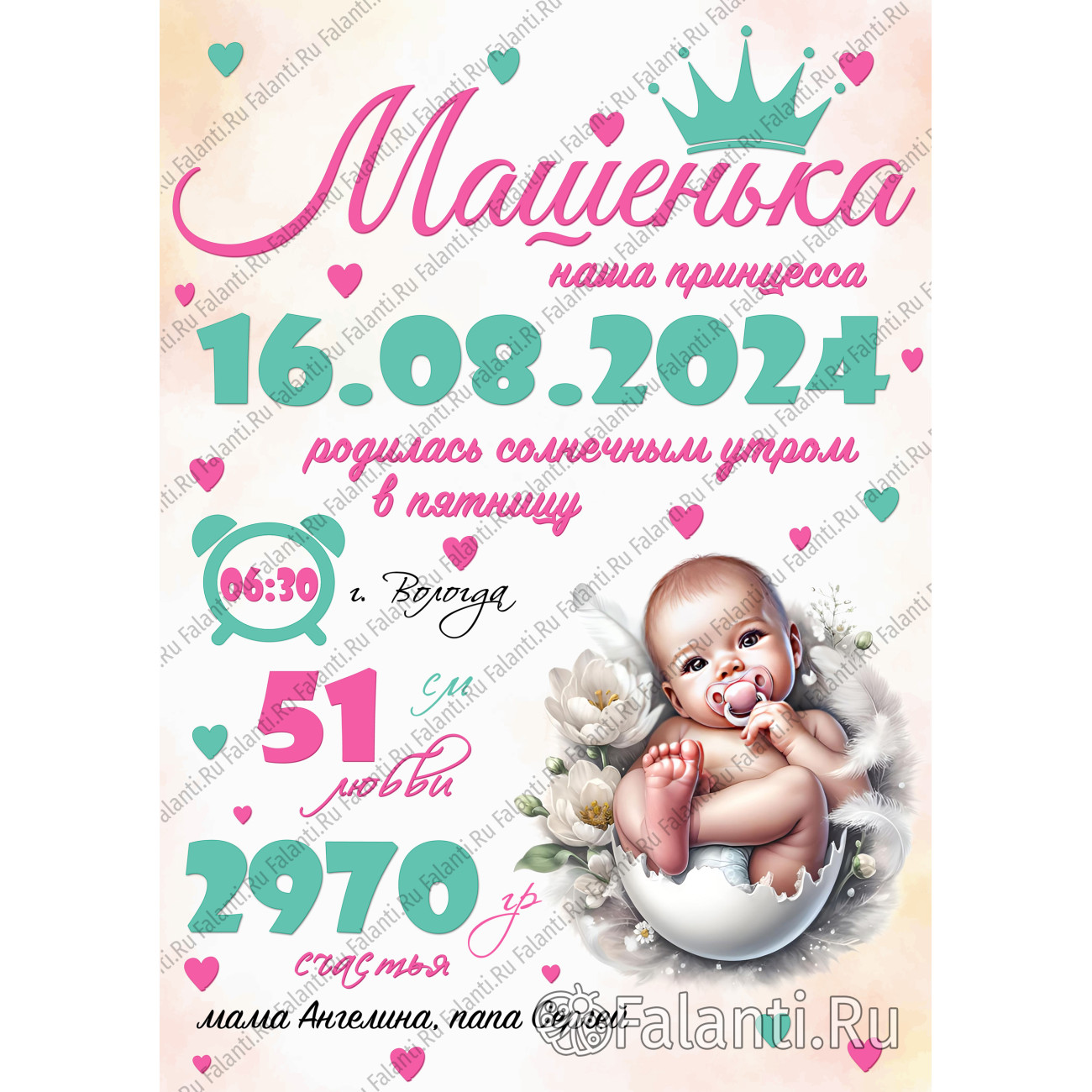 Подарите родителям не просто украшение для комнаты, а живую память — трогательный символ того, как маленькое чудо навсегда изменило их мир. Пусть каждый взгляд на этот плакат наполняет сердце нежностью, а розовые сердечки напомнят: любовь — это самое первое и главное, что получила ваша принцесса.
