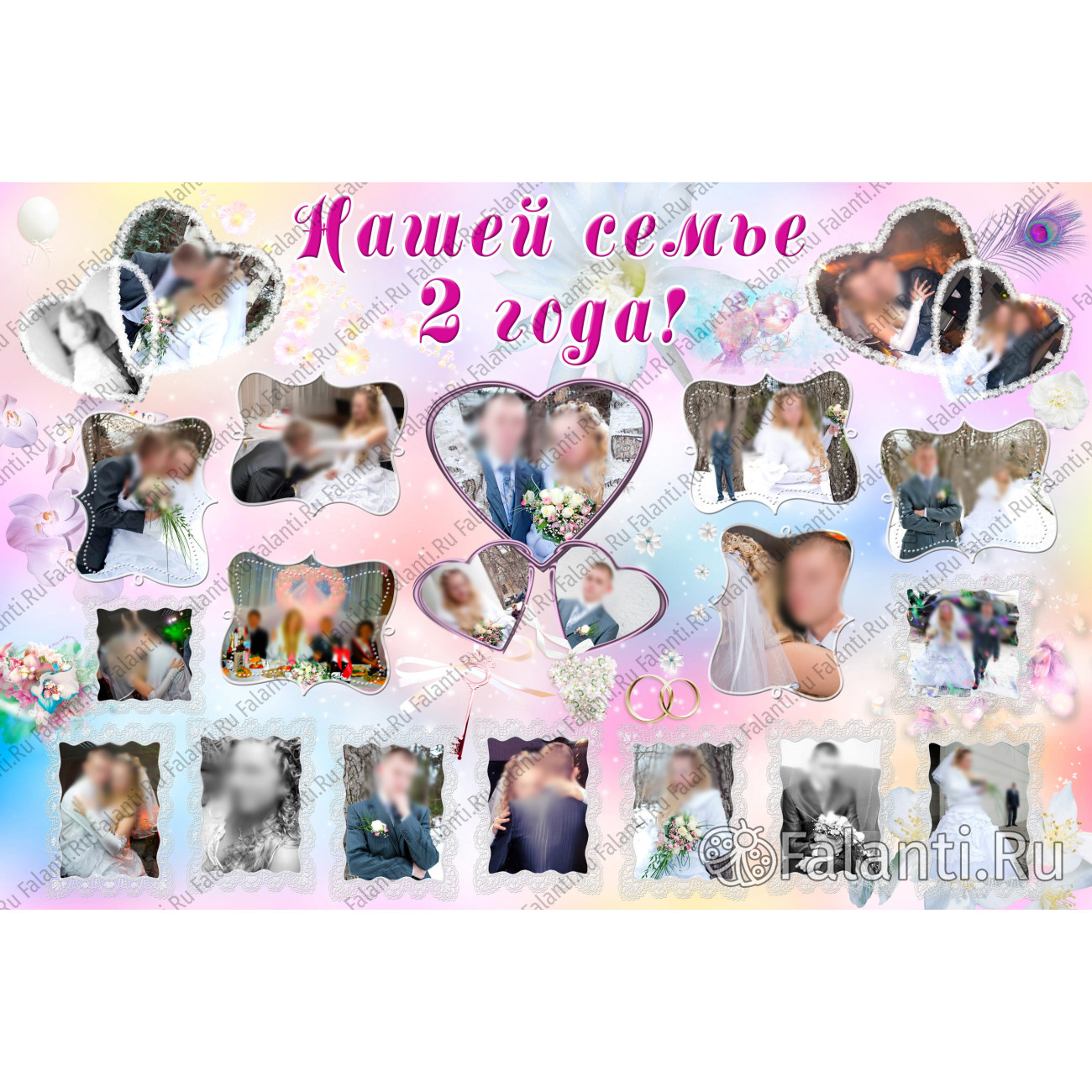 На плакате в изящных рамках различной формы и дизайна будут размещены 20–23 фотографии, запечатлевших самые значимые и счастливые моменты свадебного торжества. Каждая фотография — это кусочек памяти, который будет оживлять в воображении детали того особенного дня.