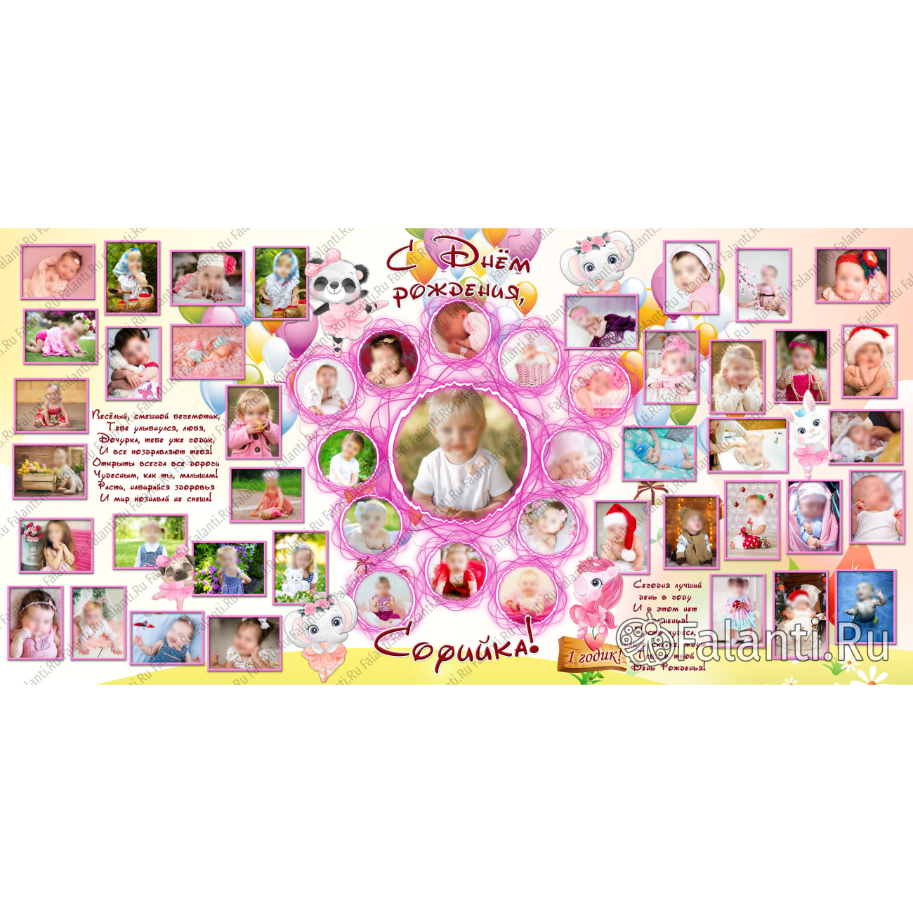 На плакате собраны самые трогательные и радостные моменты из жизни малышки: от первого взгляда на мир до её первых успехов и достижений. Пятьдесят — пятьдесят четыре фотографии, отображающие каждый этап первого года жизни, создают уникальную историю, которую с восхищением будут рассматривать все гости.