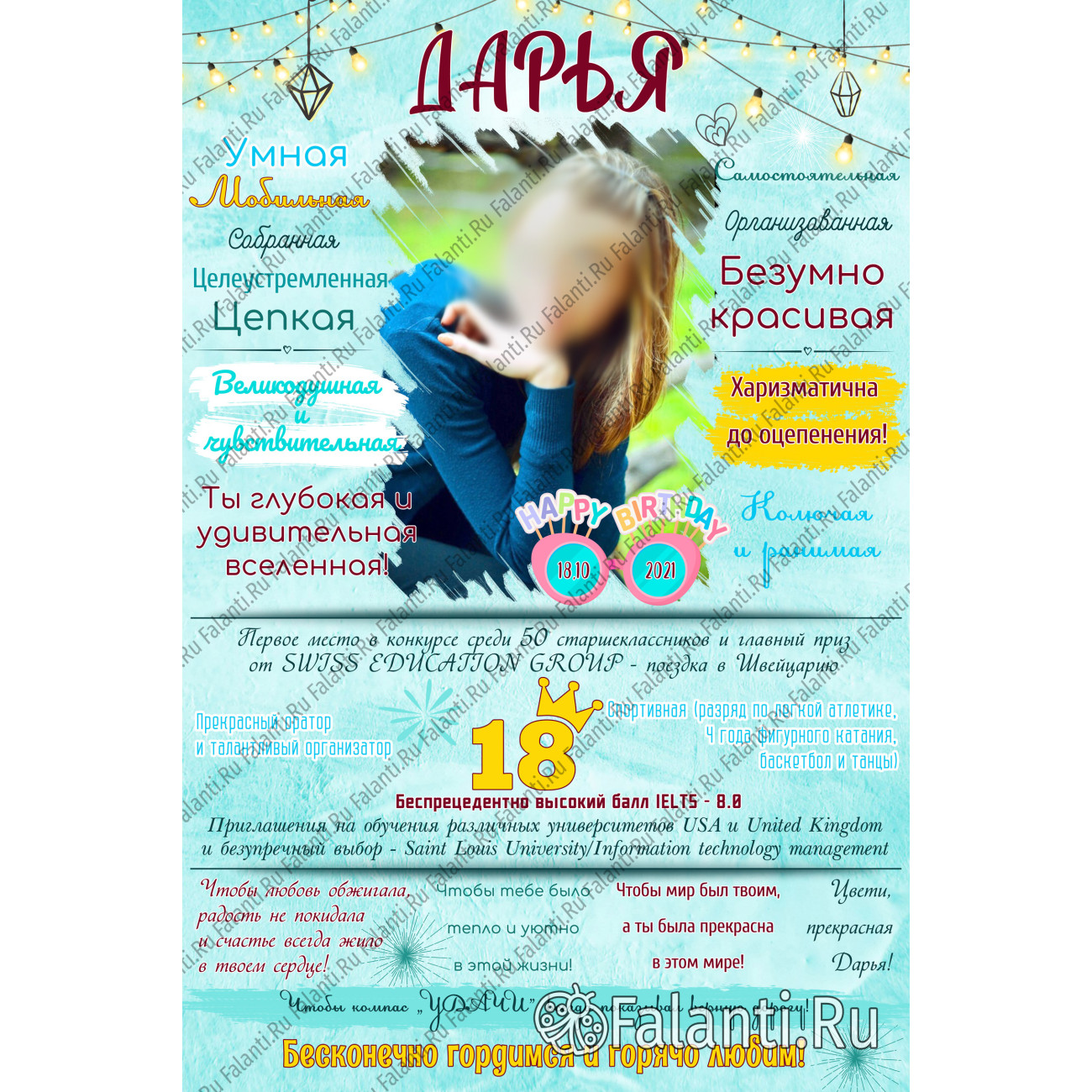 Этот весёлый и красочный постер станет отличным способом выразить ваши тёплые чувства и поздравить подругу с особенным днём. На нём будет размещено её лучшее фото, которое дополнено забавными фактами и тёплыми пожеланиями. Бирюзовый фон придаст плакату лёгкость и свежесть, делая его идеальным подарком.