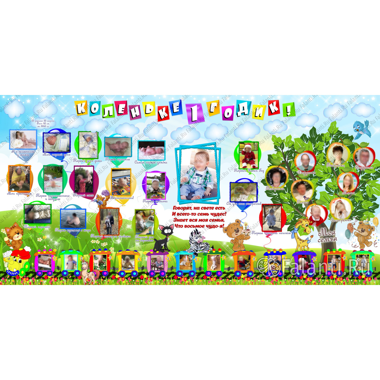 В центре плаката — главное фото, которое сразу привлекает внимание. По бокам — самые яркие и запоминающиеся моменты первого года: первые улыбки, первые шаги, радостные игры и многое другое. Особое место на плакате отводится фотографиям членов семьи: любящих родителей, заботливых бабушек и дедушек.