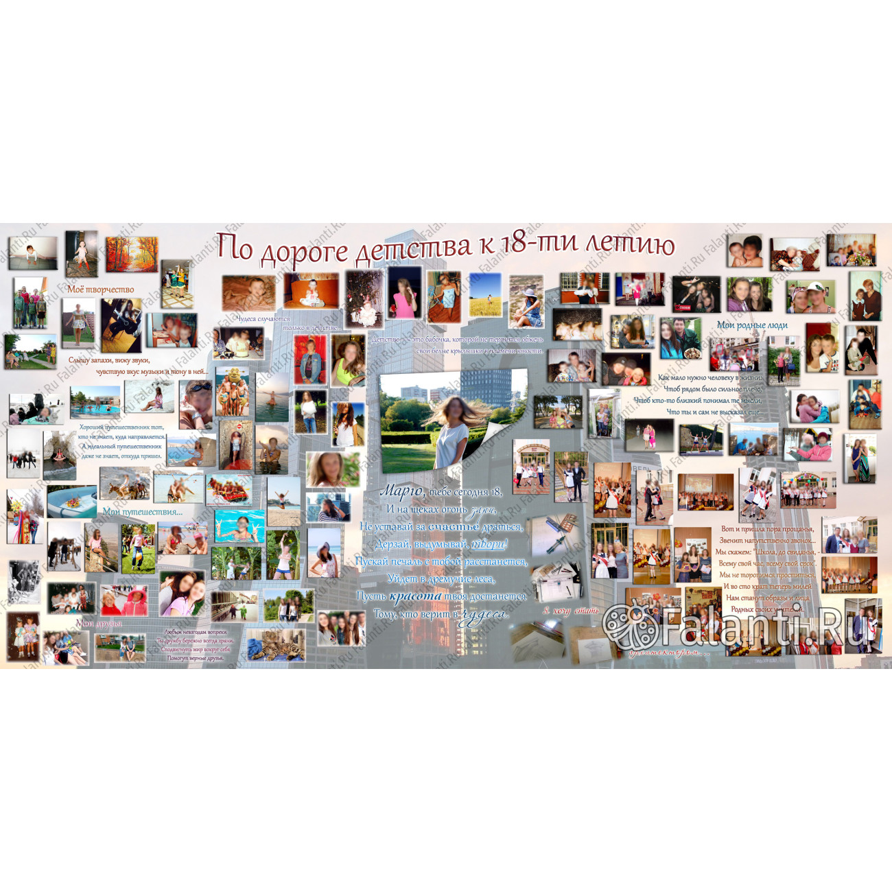 На плакате будут отражены самые памятные моменты жизни девушки, начиная с рождения и до 18 лет. Фотографии распределены по тематическим рубрикам: «Мои родные люди», «Моё творчество», «Мои путешествия» и другим. Это позволит создать структурированную и насыщенную картину жизни, которая будет радовать глаз и вызывать тёплые воспоминания.