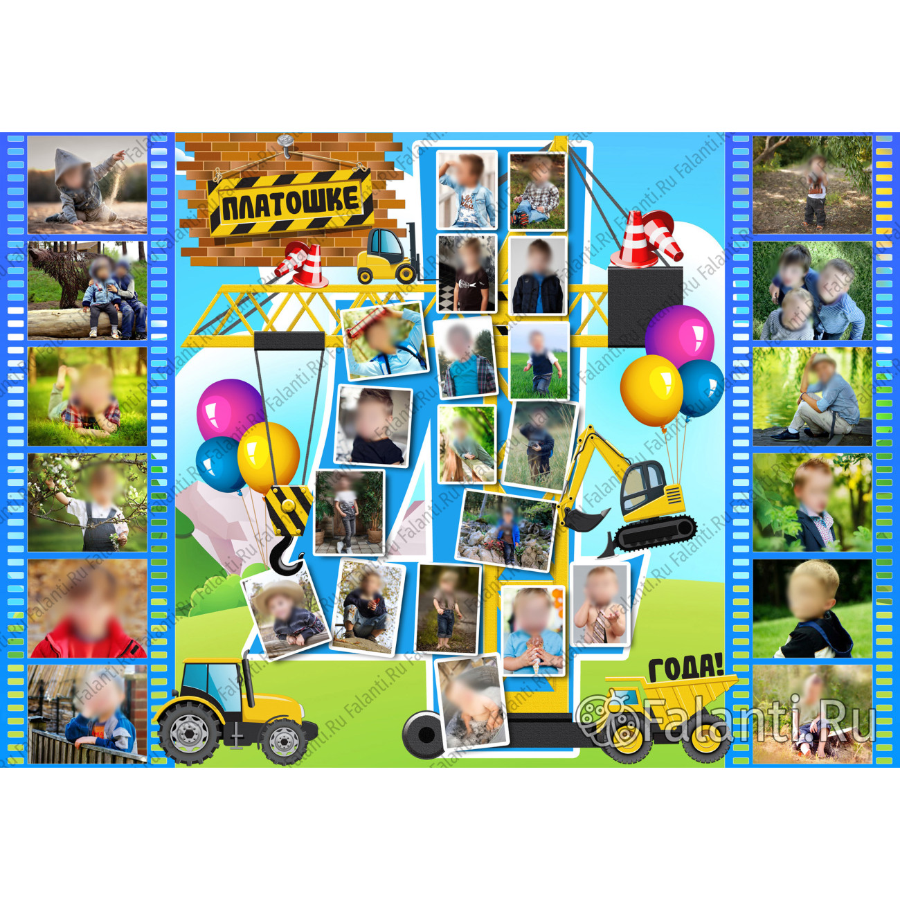 Уникальный дизайн плаката дополнен изображениями игрушечной строительной техники — настоящей находкой для маленького строителя. Каждый элемент композиции продуман до мелочей, чтобы порадовать именинника и создать незабываемую атмосферу праздника.