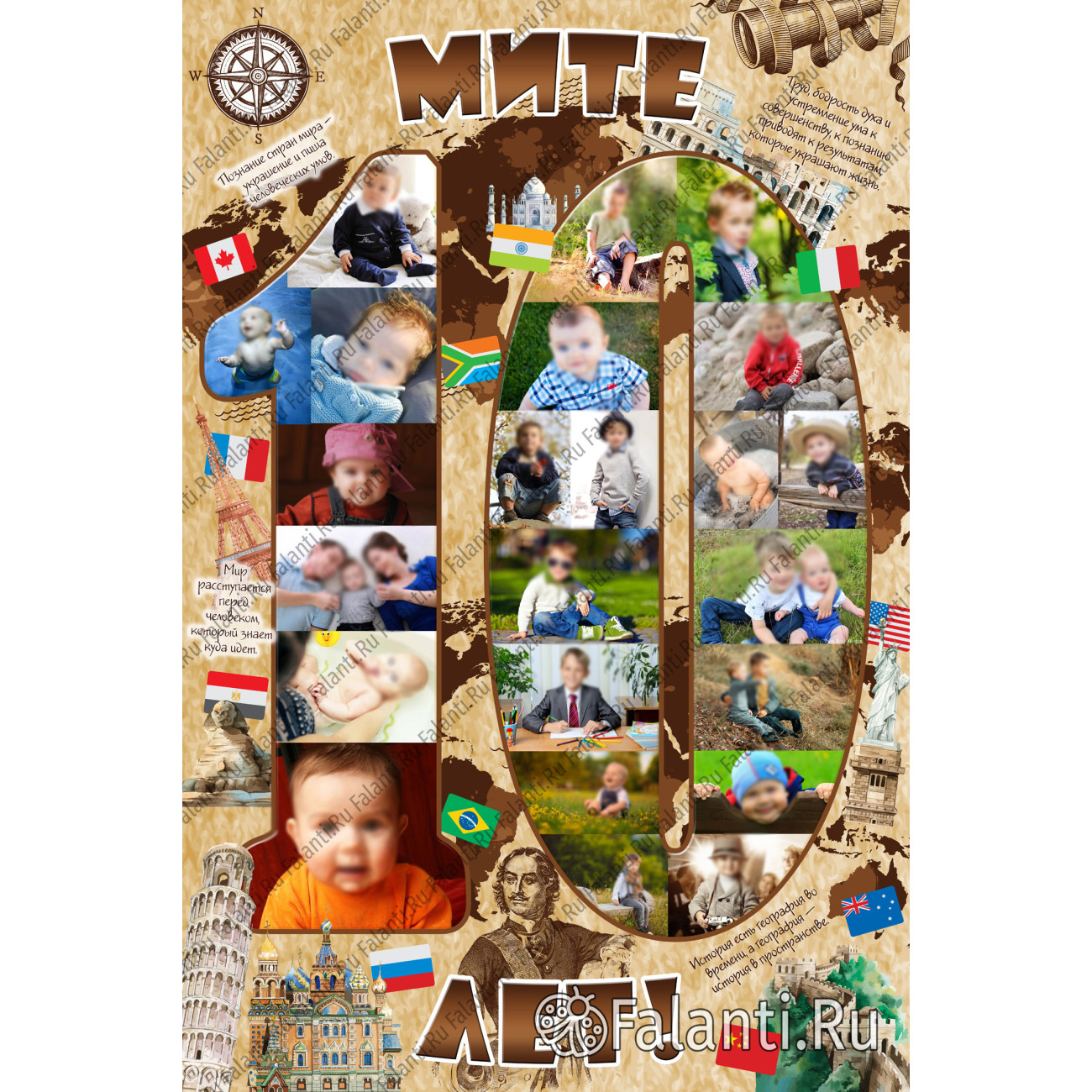 В центре композиции гордо возвышается цифра 10, словно маяк, указывающий путь к новым открытиям. Внутри неё уютно расположились фотографии именинника, а вокруг — знаменитые достопримечательности со всех уголков планеты, приглашающие в увлекательное путешествие.