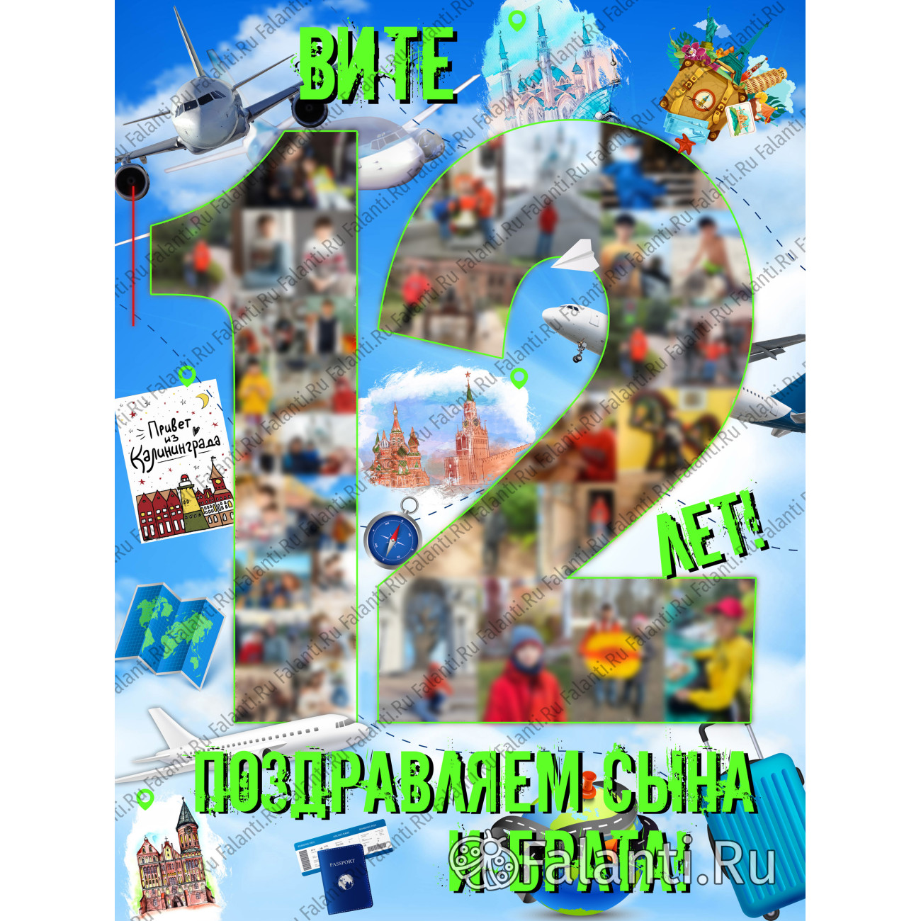 В центре композиции — величественная цифра 12, парящая в небесах. Тридцать три — тридцать пять фотографий именинника расположатся в её изящных очертаниях, а вокруг раскинется бескрайнее небо, украшенное грациозными силуэтами самолётов. Насыщенные цвета фона создают праздничное настроение и вызывают восторг при каждом взгляде.