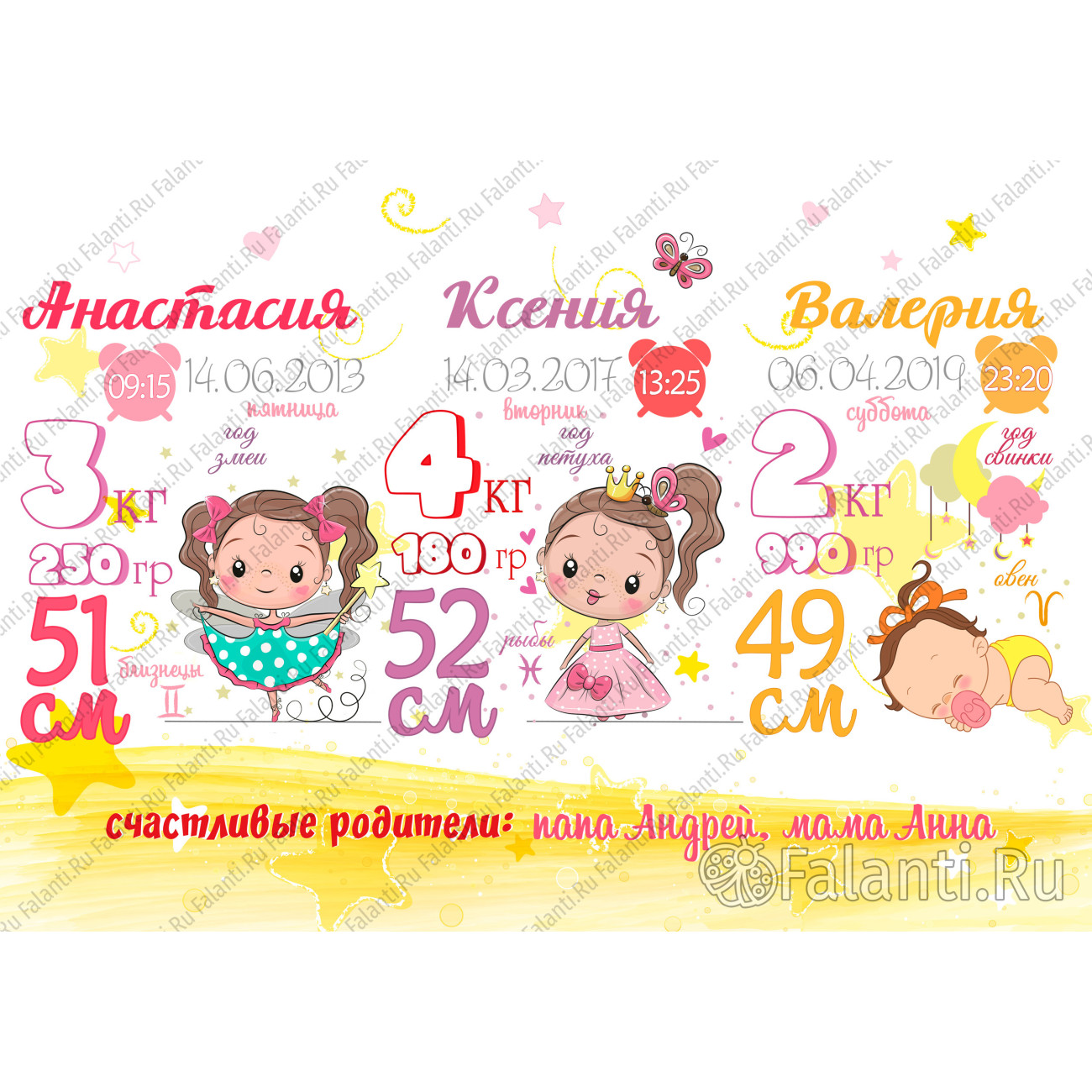 Представьте, как каждый раз, глядя на этот плакат, вы будете погружаться в тёплые воспоминания о первых днях жизни ваших детей. Здесь бережно собрана вся важная информация о каждом малыше — от первых параметров при рождении до особенных деталей, делающих этот момент неповторимым.