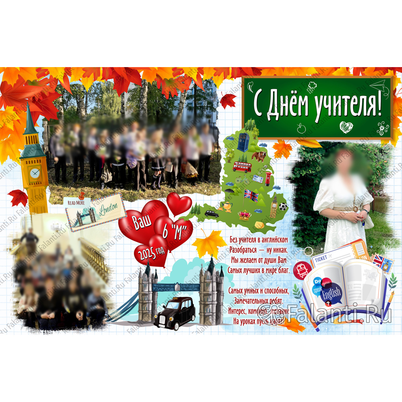 Поздравьте своего учителя с профессиональным праздником стильно и душевно! Этот тематический плакат на День Учителя, созданный в оригинальной версии для преподавателя английского языка, легко адаптируется под любого педагога. Просто выберите подходящий дизайн и тематические элементы — и персонализированный сюрприз готов!