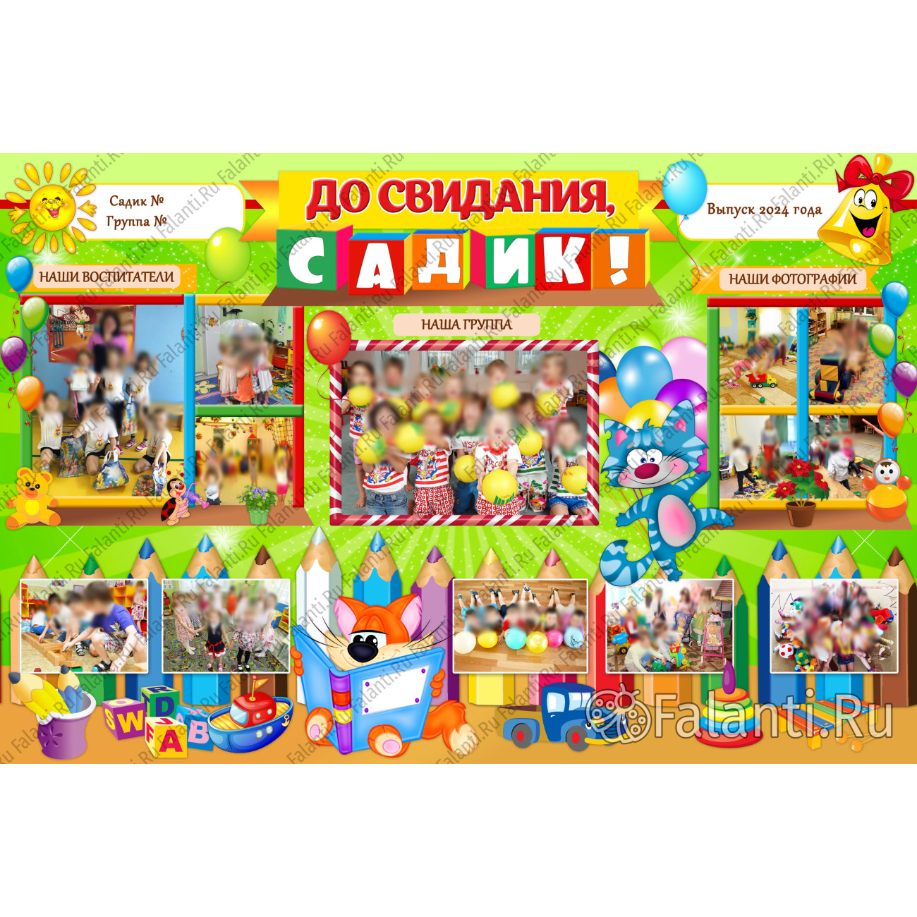 На плакате «До свидания, садик!» можно разместить яркие и весёлые фотографии из жизни группы, окружённые изображениями воздушных шариков и любимых игрушек. Такой плакат будет гармонично смотреться как в группе, так и в музыкальном зале, добавляя празднику волшебства и радости.
