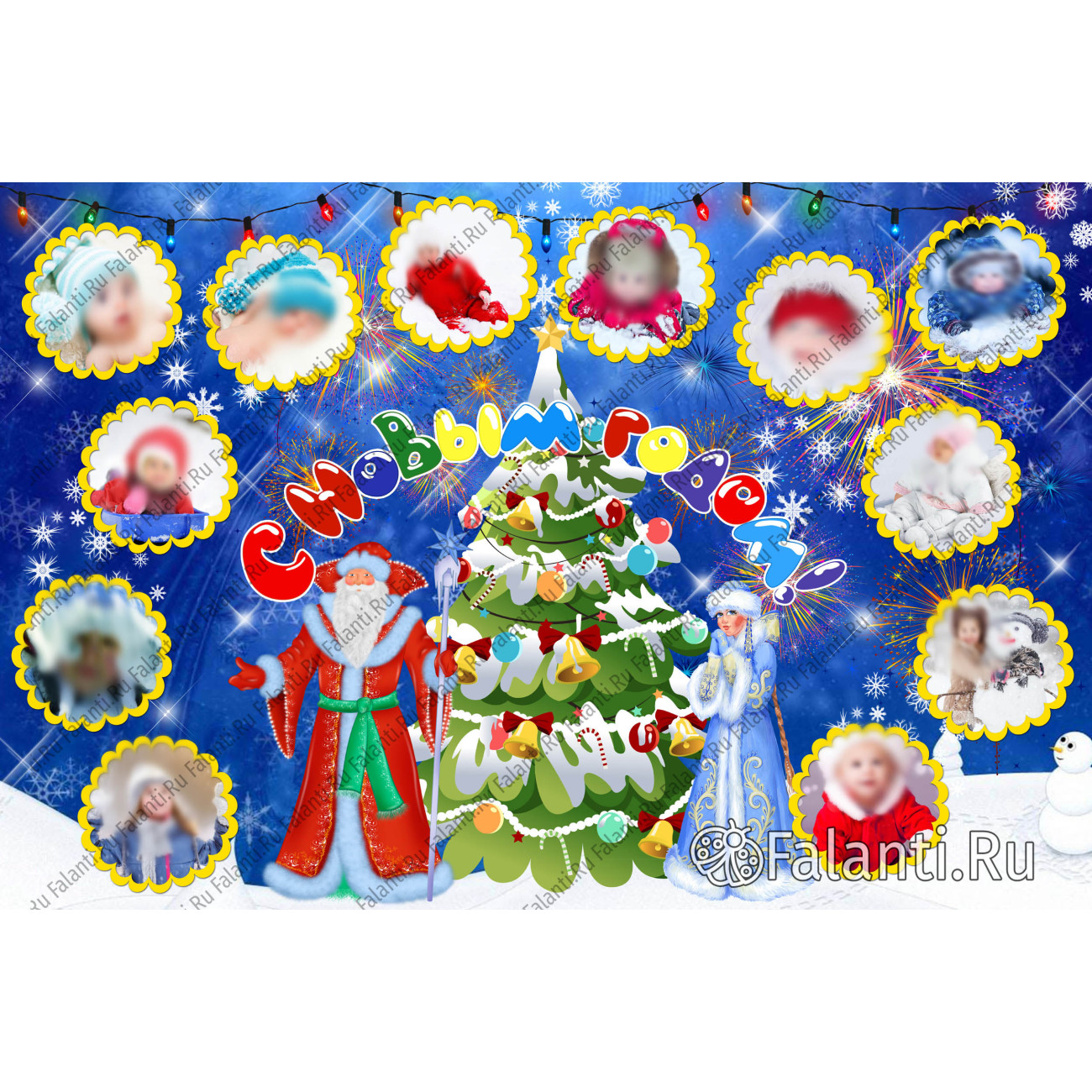 В преддверии Нового года представьте себе великолепный плакат, который словно соткан из самых ярких и тёплых праздничных мечтаний. На нём в золотистых круглых рамках сияют ваши любимые фотографии, окружённые атмосферой волшебства и веселья. В центре плаката, словно сердце праздника, возвышается нарядная новогодняя ёлочка, украшенная сверкающими игрушками и мигающими гирляндами. Рядом с ёлкой — Дед Мороз и Снегурочка, готовые дарить радость и исполнять желания.