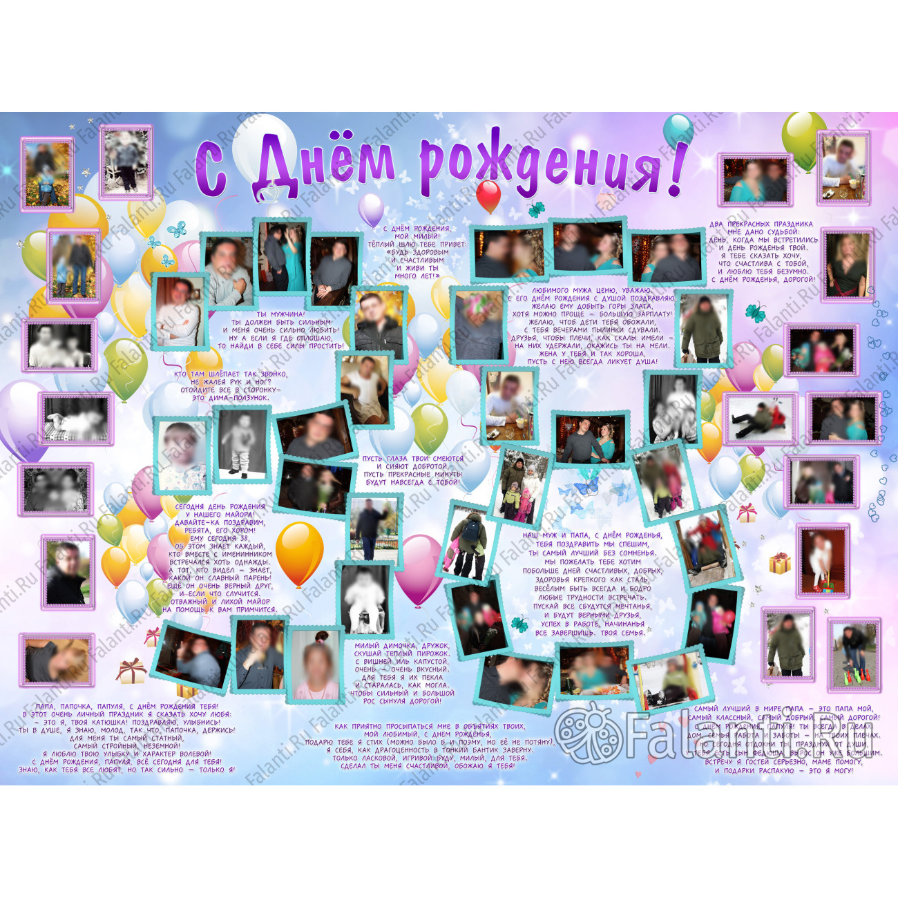 Количество фотографий на плакате — от 45 до 50 штук. Это позволит создать полную и красочную картину, запечатлев самые важные и радостные моменты из жизни вашего близкого человека.