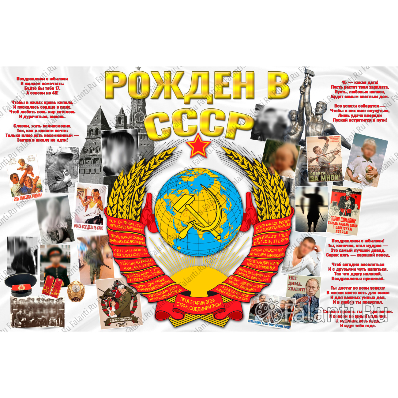 Плакат на День рождения в стиле «Рождённый в СССР» — это замечательный способ отметить особенный день и окунуться в атмосферу великой эпохи. На фоне величественного герба СССР и символики Советского Союза размещаются 11–13 фотографий юбиляра, которые словно переносят нас в прошлое и напоминают о том, как он стал частью той времени.