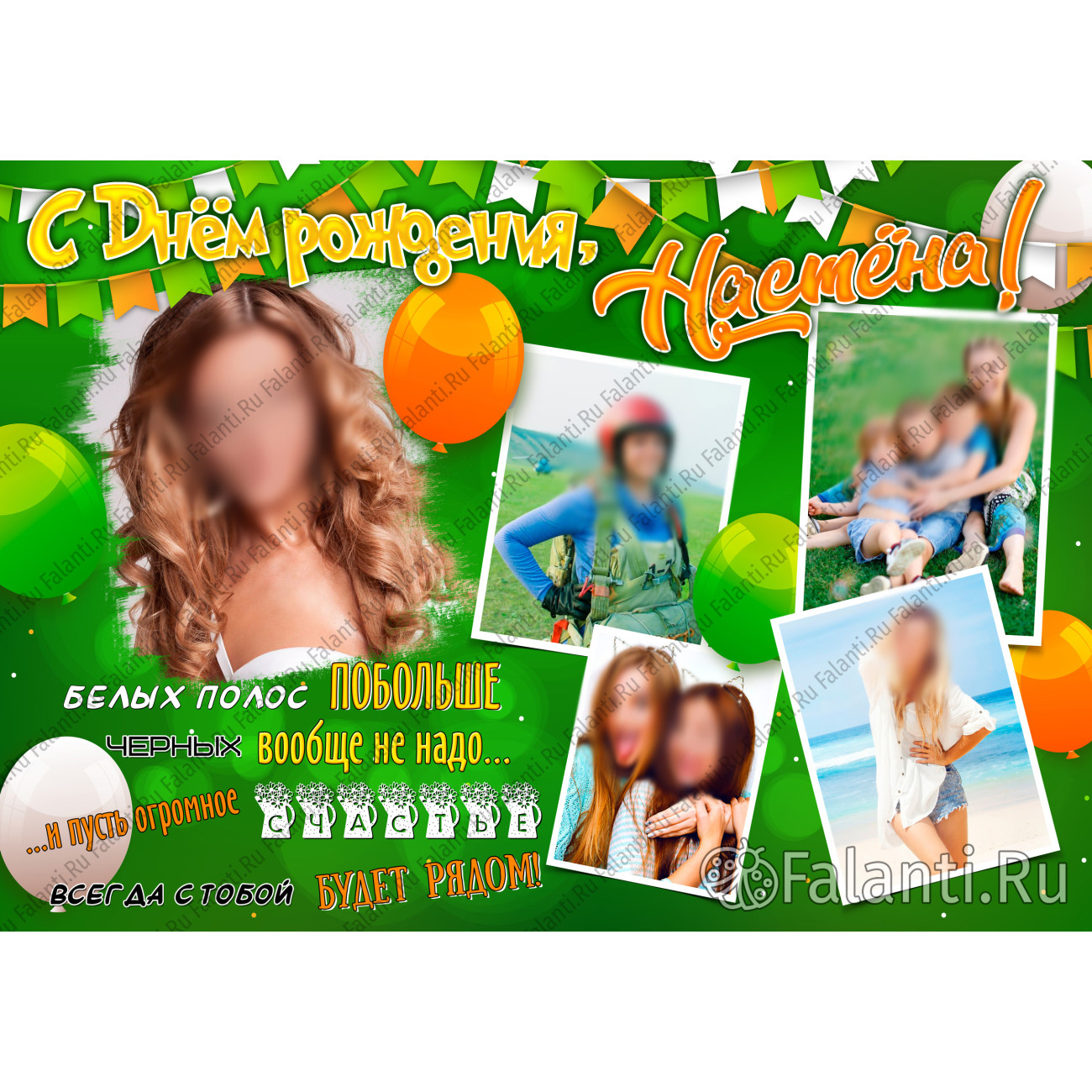 На плакате размещены 3–5 фотографий вашей подруги или сестры, что делает его личным и значимым. Поздравительный текст: «Белых полос побольше, чёрных вообще не надо, и пусть огромное счастье всегда с тобой будет рядом» — выражает самые тёплые пожелания и заботу.