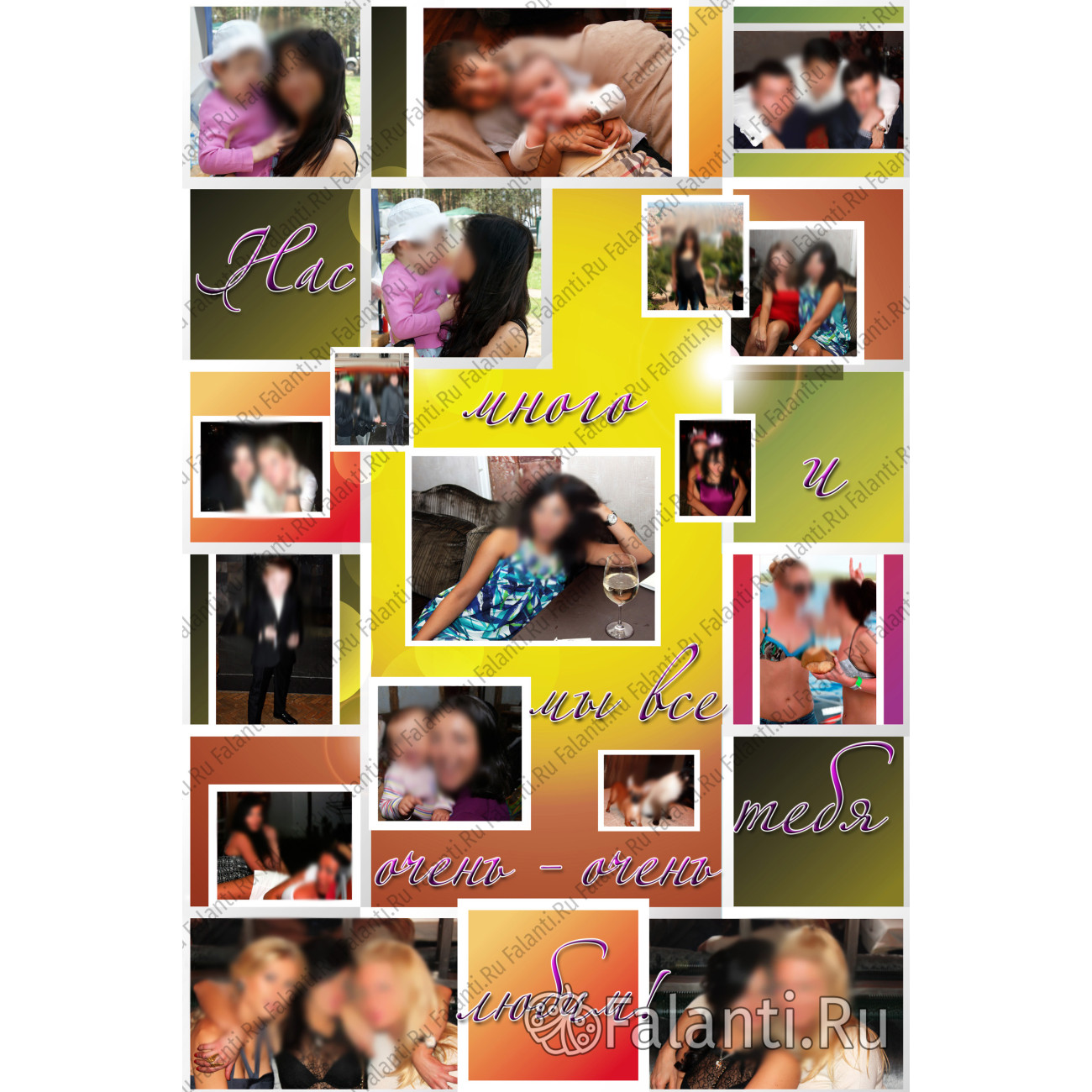 Заголовок «Нас много и мы все тебя очень любим!» станет ярким акцентом и выражением общих чувств всех, кто изображён на фотографиях. Этот плакат будет не просто подарком, а настоящим произведением искусства, созданным с любовью и вниманием к деталям.