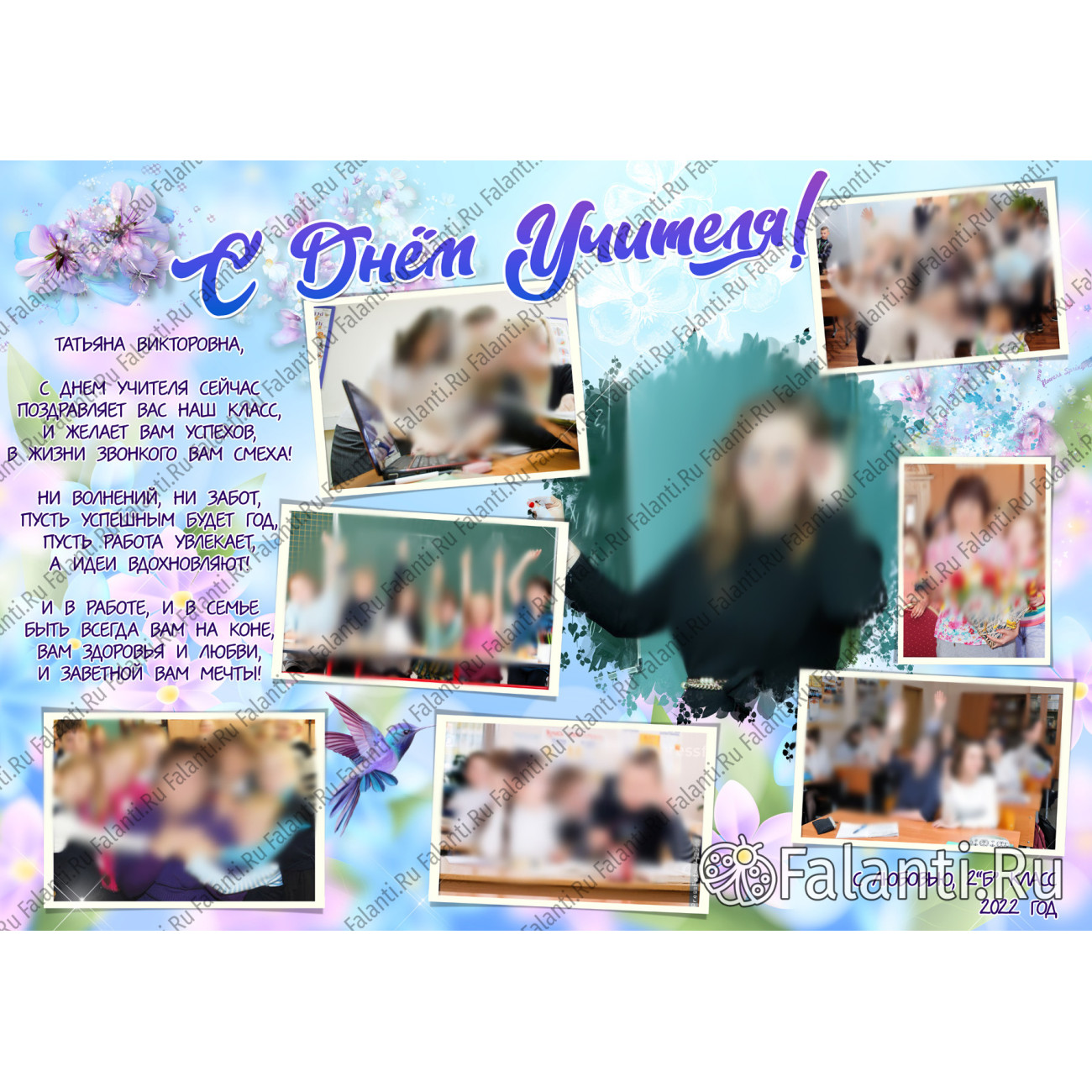 Плакат ко Дню учителя представляет собой изысканное и трогательное поздравление, выполненное на нежном цветочном фоне. На плакате размещены фотографии учителя и всего класса, заключённые в строгие белые рамки. Это придаёт плакату аккуратный и организованный вид.