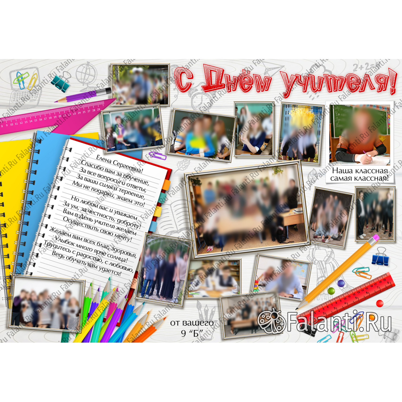 Плакат на День Учителя представляет собой изысканное поздравление, выполненное на белом фоне с изображением школьных принадлежностей. На плакате гармонично размещены 14 фотографий, которые могут быть как профессиональными снимками, так и фотографиями, сделанными учениками. На этих фотографиях можно увидеть любимого учителя и весь класс, что делает плакат особенно тёплым и личным.