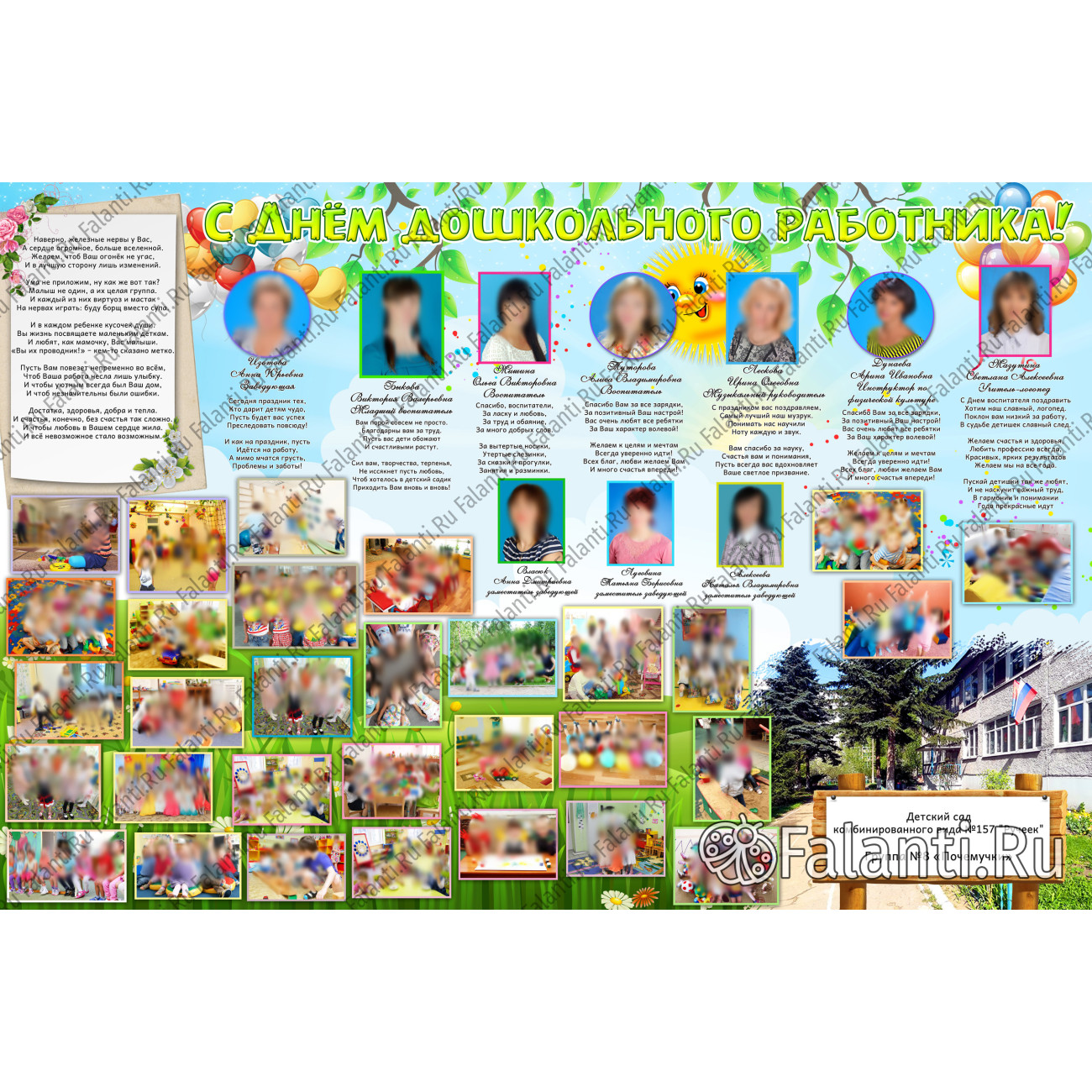 День воспитателя — это замечательный праздник, который даёт возможность выразить благодарность всем работникам детского сада: воспитателям, няням, физкультурным и музыкальным руководителям, заведующей и другим. В честь этого дня мы предлагаем создать большой и яркий плакат с фотографиями сотрудников и малышей. Каждое фото будет сопровождаться красивыми стихами, что сделает поздравление ещё более тёплым и личным.