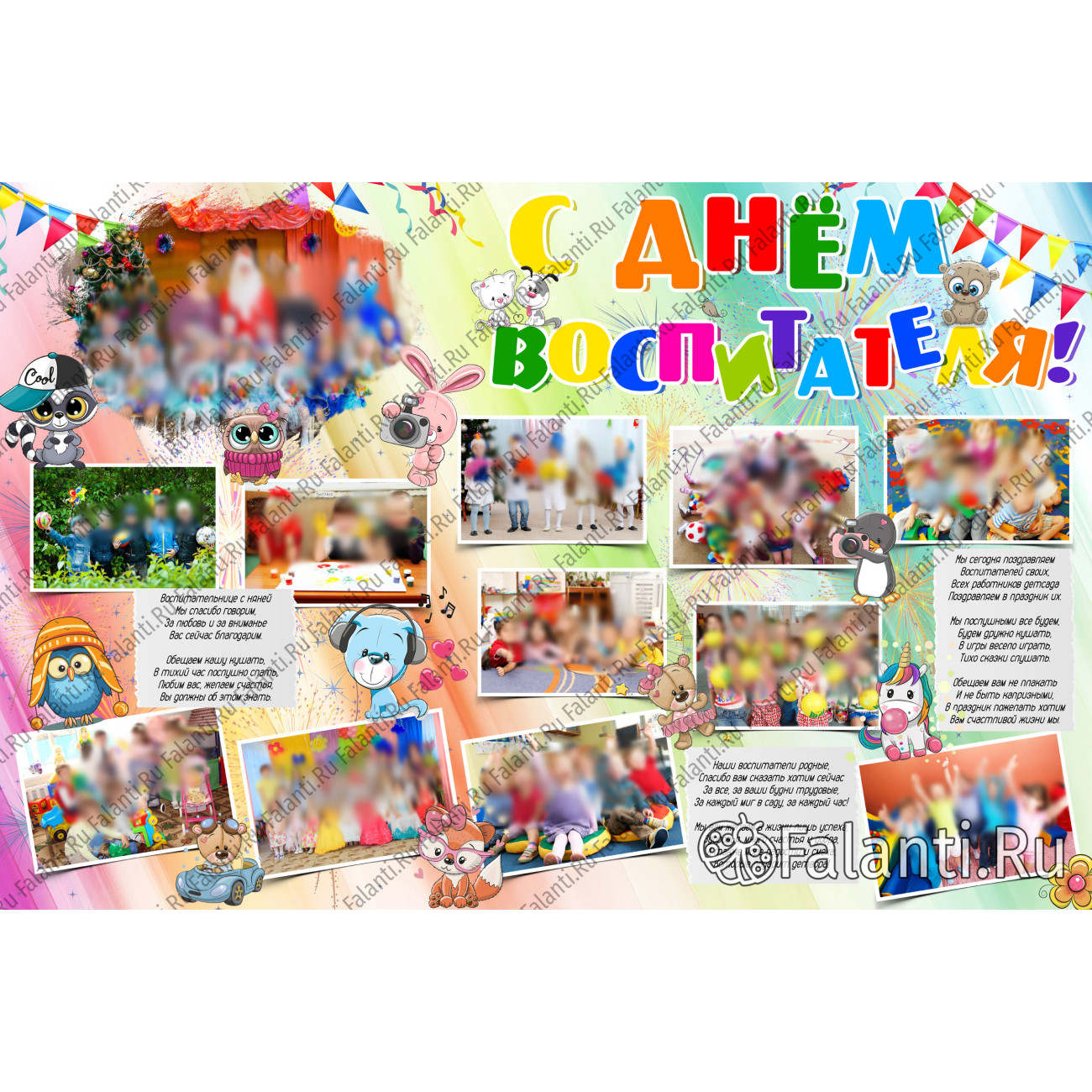 День воспитателя — это особенный праздник, посвящённый людям, которые вкладывают душу в воспитание наших детей. В честь этого дня мы предлагаем создать красивый и яркий плакат с фотографиями малышей и их воспитателей. На нём будут отражены как будни, так и праздничные моменты из жизни группы в детском саду. Такой плакат станет не только замечательным подарком ко Дню воспитателя, но и прекрасным украшением для групповой комнаты.