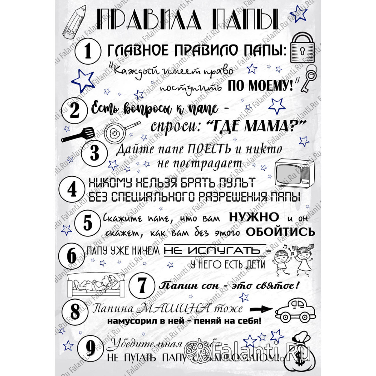 Представляем вашему вниманию уникальный плакат «Правила папы» — подарок, который тронет даже самое сдержанное отцовское сердце. В нём гармонично переплетаются юмор и теплота, ирония и искренность, создавая тот самый неповторимый характер, который присущ каждому отцу.