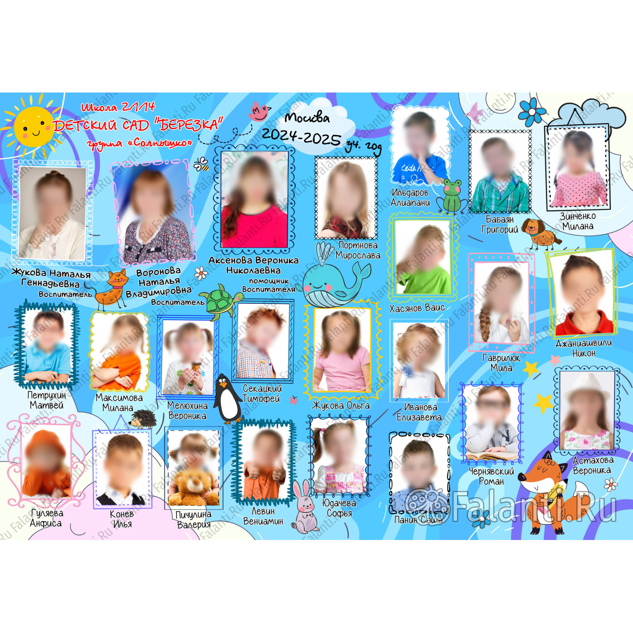 Нежный сине-голубой фон, словно небо в летний день, украшен фотографиями детей группы и их любимых воспитателей. Каждая фотография — это кусочек сердца, подписанный именем и фамилией, превращающий виньетку в уникальный альбом воспоминаний. А милые зверюшки-клипарты добавляют волшебства и тепла, делая плакат по-настоящему особенным.