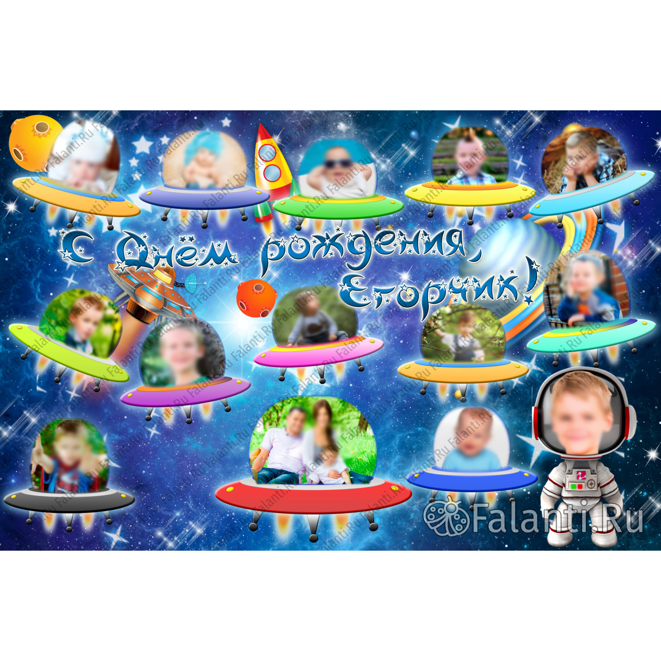 Откройте для себя удивительный способ сохранить самые драгоценные моменты первого года вашего крохи! На этом волшебном плакате 12 фотографий малыша, словно маленькие космические путешественники, парят в летающих тарелках на фоне загадочного звёздного неба.