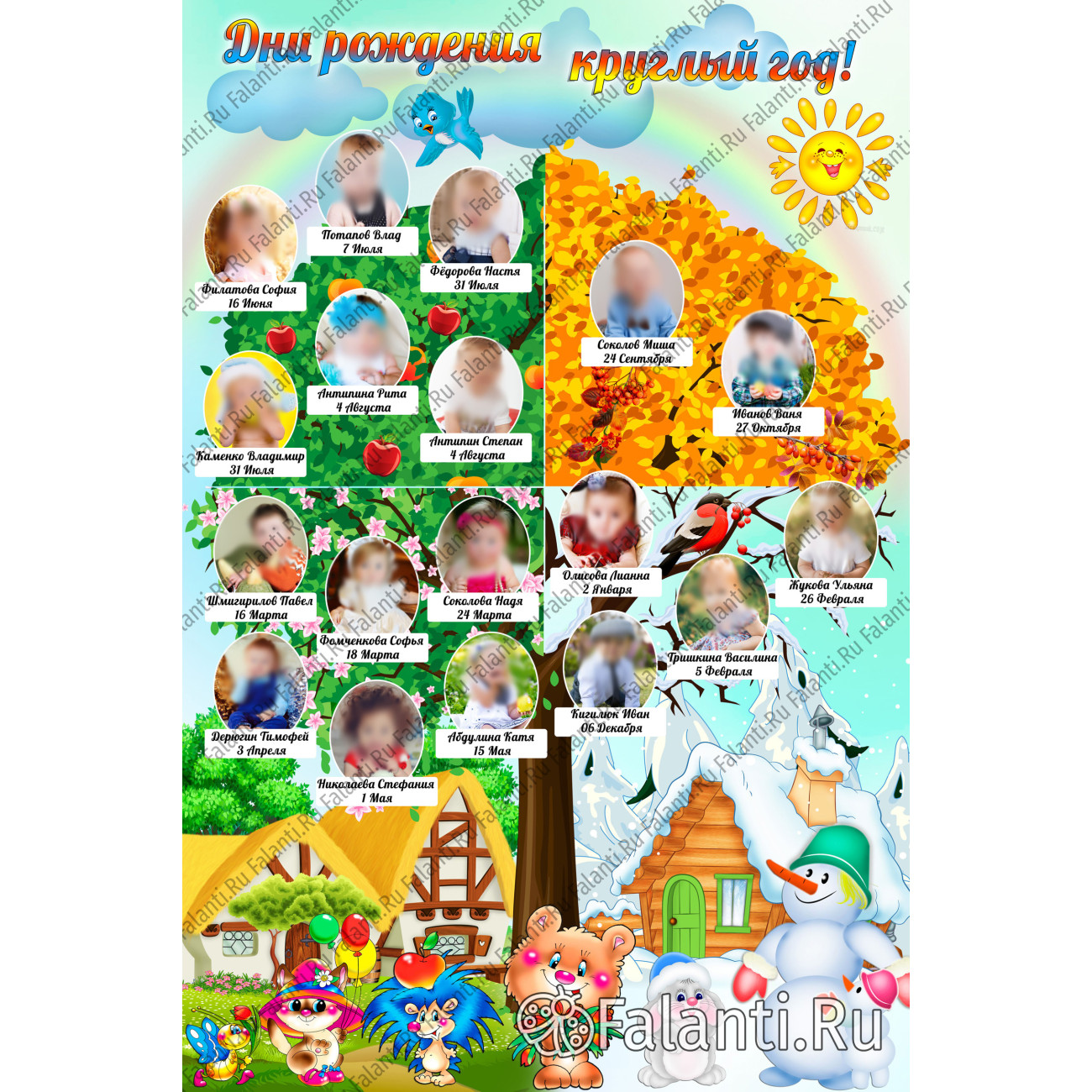 Этот плакат — не просто декоративный элемент, а настоящий праздник для именинников и их друзей. Он разделён на четыре секции, каждая из которых символизирует одно из времён года. Такая концепция позволяет детям лучше ориентироваться в сезонах и запоминать даты рождения своих друзей.