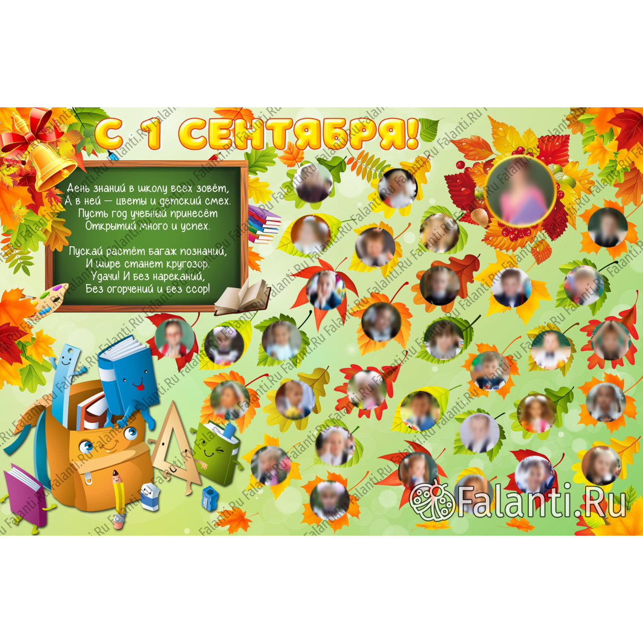 На таком плакате можно разместить фотографии учеников, сделанные во время праздника. Они будут обрамлены в рамки в виде осенних листочков, что придаст плакату особую атмосферу. На школьной доске будет красоваться тёплое и искреннее поздравление для класса, написанное красивым шрифтом.