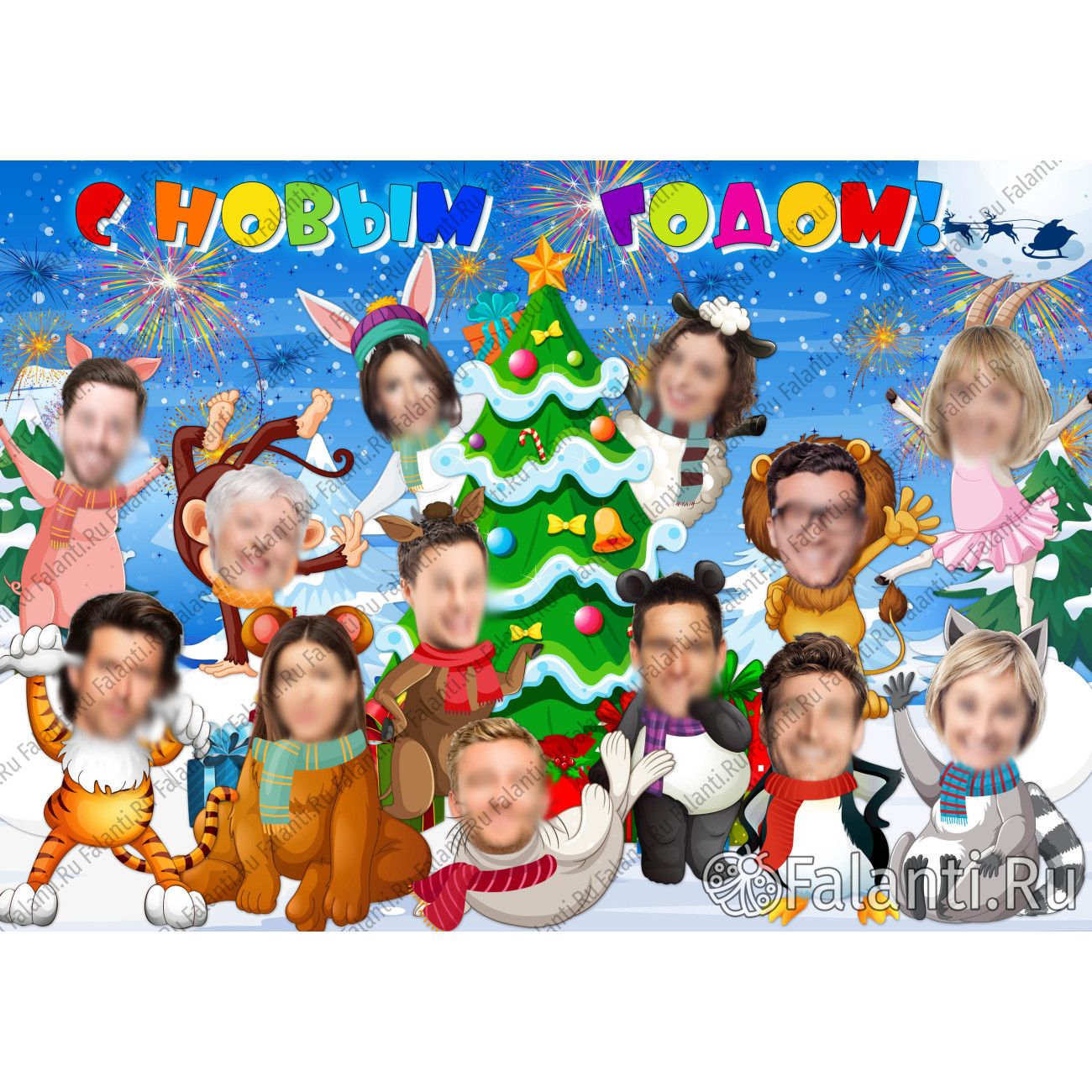 Шуточный новогодний плакат — это великолепный способ поднять настроение и создать весёлую атмосферу на празднике! На нём изображена нарядная ёлка, вокруг которой размещены фотографии сотрудников или учеников класса. Вместо мордочек животных — лица людей, что позволит каждому узнать, с каким животным его ассоциируют коллеги или одноклассники. Такой плакат станет оригинальным и забавным подарком на Новый год!