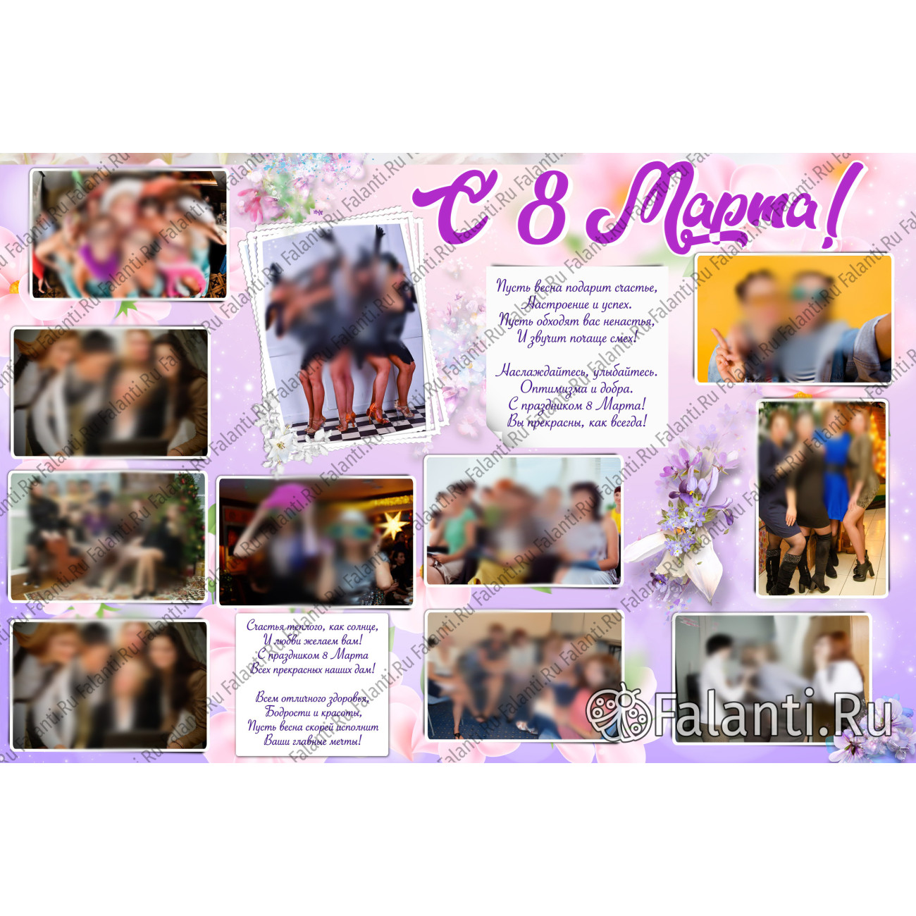 Мы предлагаем вам возможность создать уникальный и запоминающийся подарок девушкам на 8 марта. На плакате будут размещены фотографии представительниц вашего коллектива. Наши дизайнеры бережно обработают каждую фотографию, чтобы сделать плакат по-настоящему красивым и торжественным.