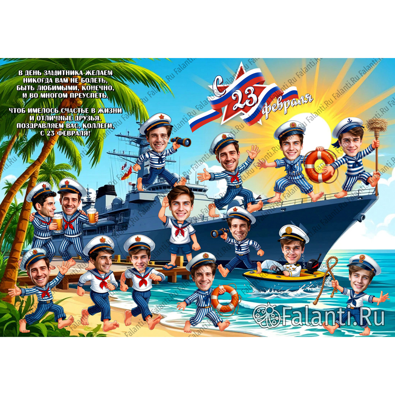 Это не банальный плакат на 23 февраля, а уникальная композиция, созданная специально для вашего коллектива. Личные фотографии превращаются в кадры из весёлого морского фильма, где каждый — главный герой.