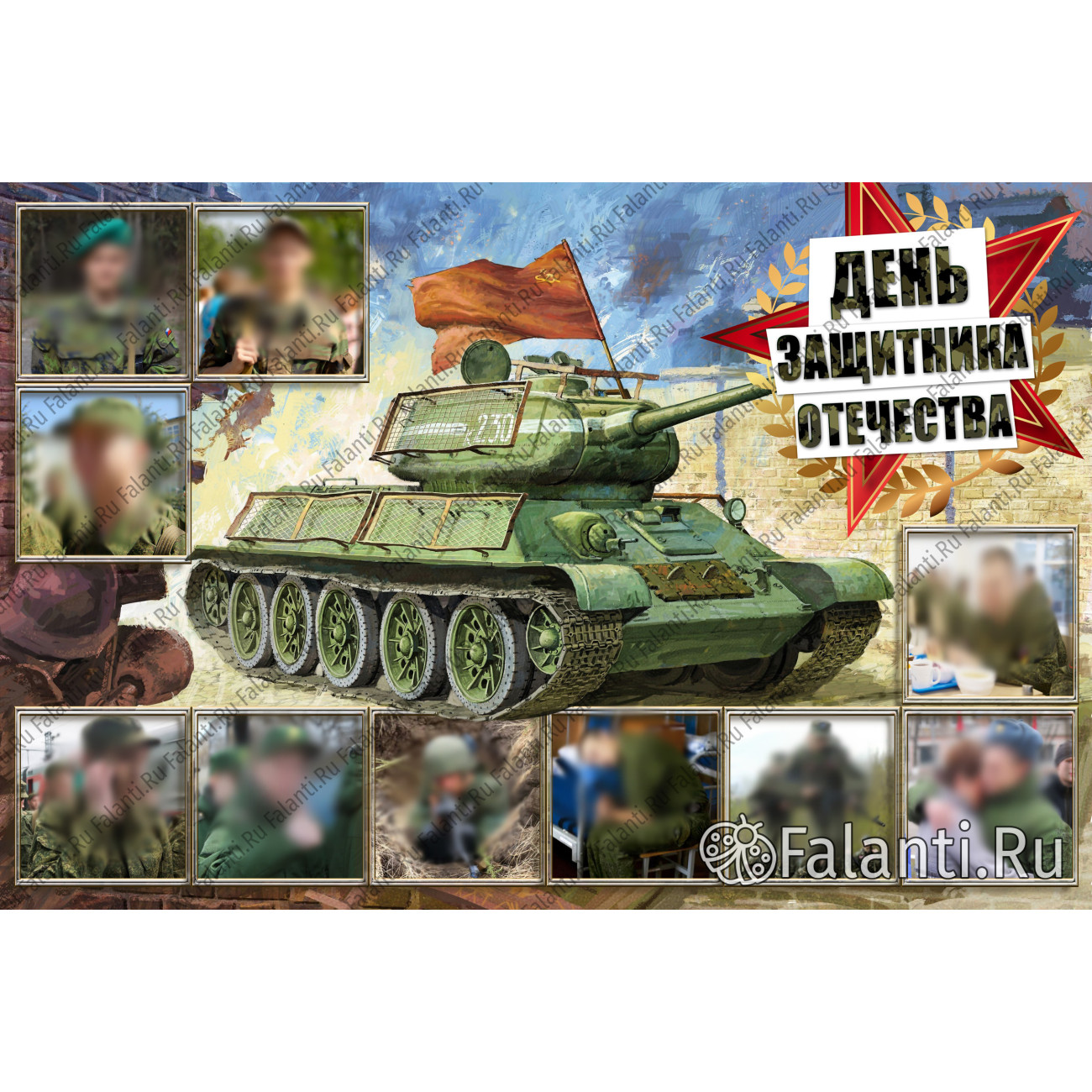 Представьте себе яркий и торжественный плакат, посвящённый Дню защитника Отечества. На нём — фотографии ваших близких, друзей или коллег, которые для вас являются настоящими защитниками. Их изображения размещены на фоне мощного танка, символизирующего силу и готовность к защите.