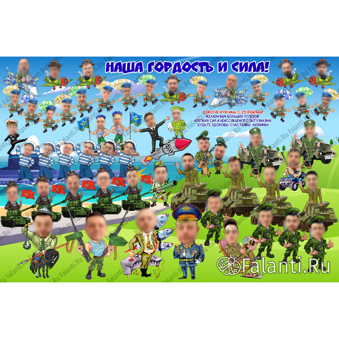 На плакате будут размещены лица ваших коллег, вмонтированные в забавные и оригинальные костюмы военных. Это создаст незабываемый эффект и вызовет улыбки у всех, кто его увидит.