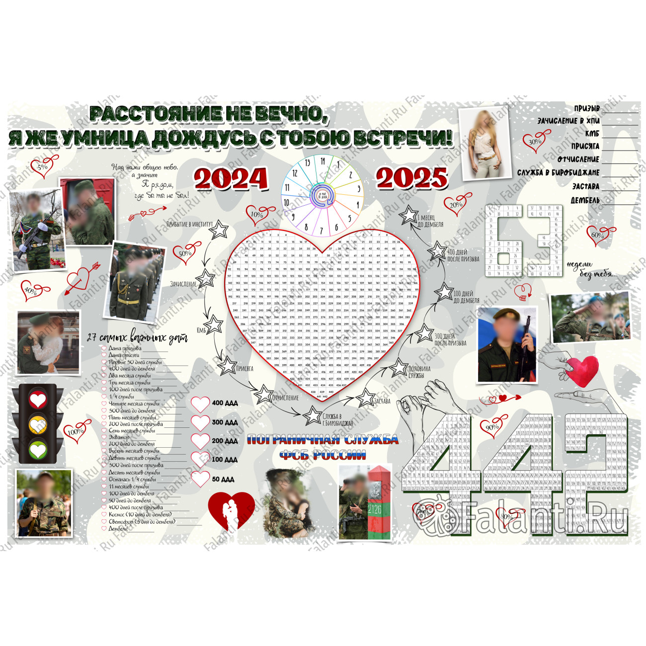 Уникальный дизайн календаря включает большое сердце с ячейками для каждого дня службы. Закрашивая их разными цветами, вы визуально видите, как приближаются долгожданные дни встречи.
