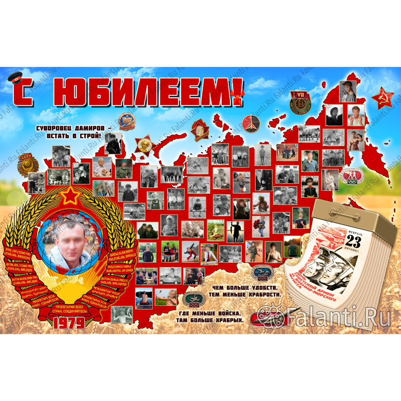 Дополнительно на плакате размещены советская символика, флаги и другие атрибуты, которые напоминают о славных временах Советского Союза. Эти элементы придают подарку уникальность и особую атмосферу, позволяя юбиляру вновь ощутить дух тех лет.